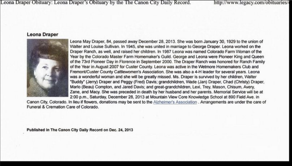 Leona Draper, long-time Wetmore resident, has passed away in 2013.