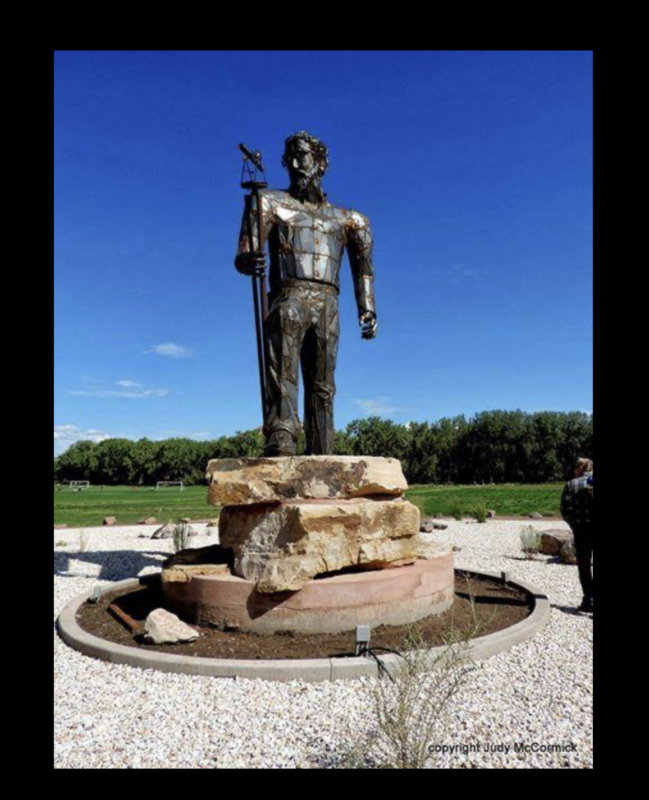 stands in the center of the roundabout at Pathfinder Regional Park near Florence, Colorado. Dedicated in September 2013, the statue was designed by local artist Sheldon Roberts to honor the county’s namesake.